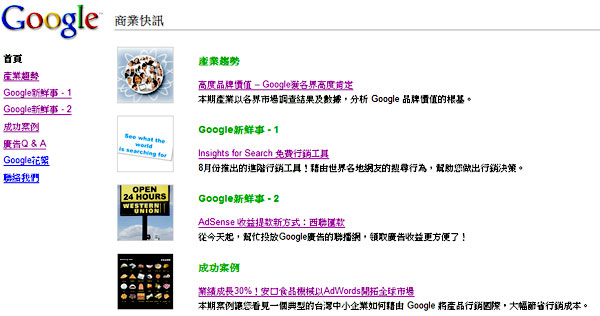 自2008年7月起,Google 台灣發行了《 Google 商業快訊 》。 Google 台灣團隊製作了這份月刊,期望提供業界趨勢分析、網路行銷工具介紹、網路行銷成功案例、常見網路行銷疑難解答,及 Google 最新動態等內容﹔盼能以精簡篇幅,在您日常緊湊的時間中,提供您全方位網路行銷相關訊息。