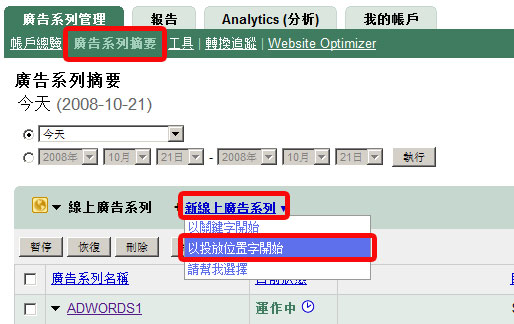 首先,你先到「廣告系列摘要」去新增一個「投放位置」,然後再經過一個關鍵的手續後,你就會在看到下圖的下圖部分囉!