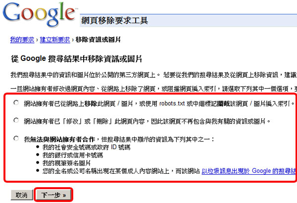 ( 點擊上圖可連結到網頁移除要求工具的起始頁!)
